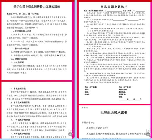 這次恒大撒錢(qián)似得賣(mài)房子,有個(gè)條件是二月底之前你要先交5000元定金,預(yù)定一套恒大的房子。另外你如果在五月十號(hào)之前確定要買(mǎi)的話(huà),這5000元定金可以抵2萬(wàn)元的房款,你等于省了一萬(wàn)五。如果你不想買(mǎi)了,你推薦別人買(mǎi),5000元全款退給你,你還可以得到1%的現(xiàn)金。要知道現(xiàn)在一套房子少說(shuō)一兩百萬(wàn),那么你就能賺一兩萬(wàn)。另外如果你訂得房子有人買(mǎi)了,那么恒大除了退你5000元定金,還補(bǔ)償你5000元。等于你還賺5000元。最重要的一點(diǎn)是:大家擔(dān)心因?yàn)橐咔橛绊懀績(jī)r(jià)會(huì)不會(huì)降。這時(shí)候恒大給你承諾的是你是在5月10號(hào)之前你擁有最低價(jià)的購(gòu)房權(quán),也就是說(shuō)付過(guò)房?jī)r(jià)降了,恒大補(bǔ)償價(jià)給你。如果你后悔了,只要在交房前都可以無(wú)理由退房。