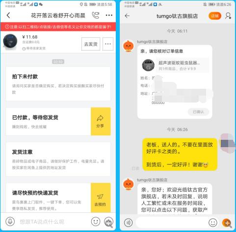 上架之后,隨手再打一個8折。半天時間,就有人直接下單了。隨手淘寶9.9元代拍,填上閑魚買家地址,順便給老板說一聲:東西是送朋友的,不要放好評卡之類的。(言下之意就是,你如果放了我可能就會差評,你不放我肯定好評)