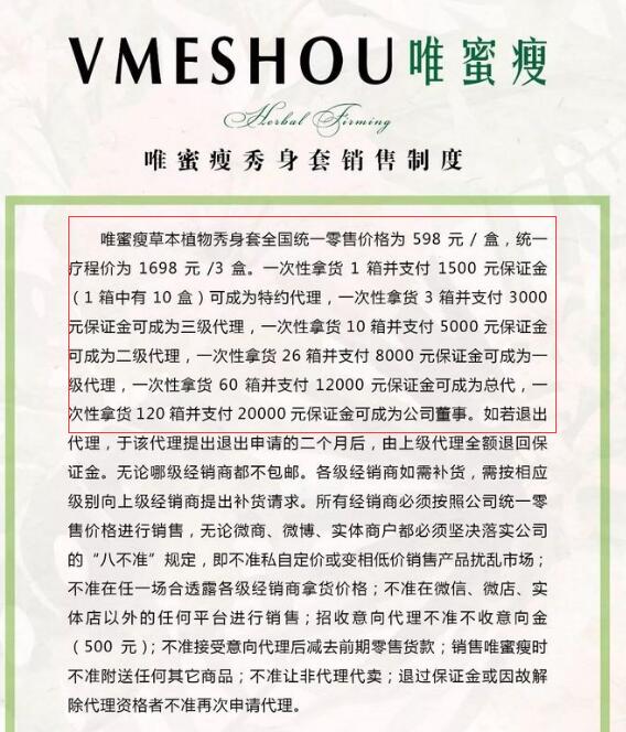 當(dāng)我問到哪里買的時(shí)候:他說唯蜜瘦官方聲明為了保障唯蜜瘦代理們的權(quán)益,所有注冊代理不得在網(wǎng)絡(luò)平臺諸如天貓,淘寶,閑魚,京東,平多多等平臺銷售,產(chǎn)品定位為公司+工廠+旗艦店+微商模式+展會+市?集+線下推廣?。所以只能在他那里買。