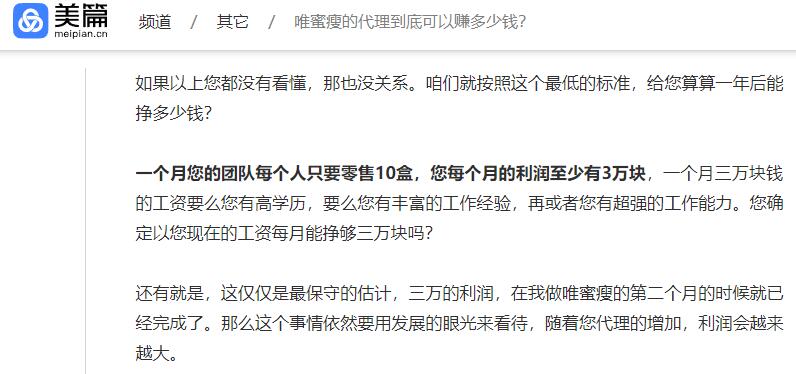 然后也自己百度了一下,網(wǎng)上有的人說190,有的人說200多,其實(shí)都是胡亂說的,不過有一篇關(guān)于唯蜜瘦的文章,讓我驚呆了。寶媽和我說的話,居然和這里一模一樣。哈哈,看來他們代理都是有培訓(xùn)過話術(shù)的!