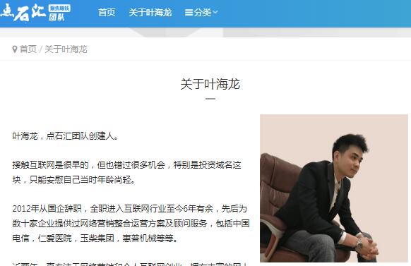 平臺(tái)介紹:點(diǎn)石匯團(tuán)隊(duì)-專注于拆解網(wǎng)上賺錢項(xiàng)目_服務(wù)網(wǎng)絡(luò)創(chuàng)業(yè)者的網(wǎng)賺博客,葉海龍是「點(diǎn)石匯團(tuán)隊(duì)」創(chuàng)建人,8年網(wǎng)上賺錢實(shí)戰(zhàn)經(jīng)驗(yàn)。致力于分享網(wǎng)絡(luò)賺錢項(xiàng)目,服務(wù)網(wǎng)絡(luò)創(chuàng)業(yè)者的博客。
