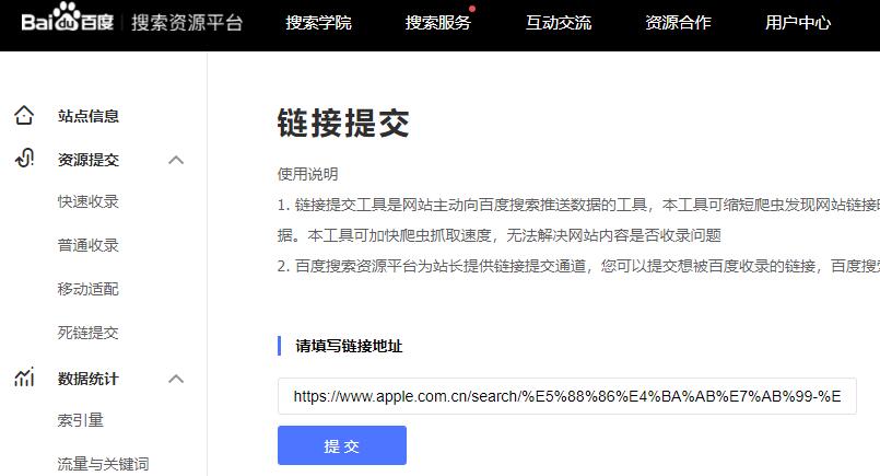 比如下圖:我們去蘋果的官網,搜索“分享站 微信XXX”,這個搜索內容就是你想讓別人看到的廣告信息,然后搜索結果頁面,就是一個蘋果官網的鏈接。然后把上面的鏈接復制下來,去百度網頁提交,不知道就百度搜索:百度提交網站。然后直接提交,坐等收錄!