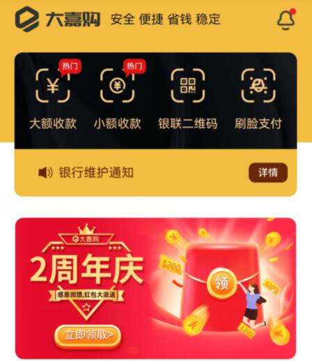 大嘉購APP屬盛迪嘉支付公司,全國只有的150家支付公司之一,可以說支付公司出來的無卡支付平臺肯定是靠譜的,和前面兩個平臺一樣,支付公司是非常重要的!目前除了前面兩和平臺,大嘉購APP算是第三靠譜的平臺。費率和功能基本上也和前面兩個平臺差不多,目前大嘉購還有紅包活動,加上紅包算上首刷都是免費的,還是挺劃算的。