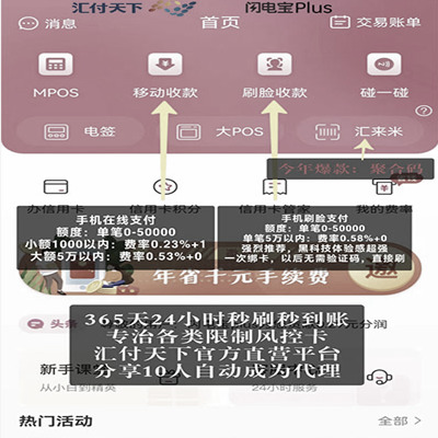 平臺介紹:閃電寶plus是匯付天下推出的支付平臺,聚合了線上線下等多種支付形態(tài),功能有移動收款、刷臉收款、小額收款、MPOS、大POS、碰一碰、電簽等,并以0.23-0.60的超低費率,并且刷卡秒到賬,極大的方便了客戶的刷卡需求,客戶只需下載APP不用機(jī)器,無需帶卡,隨時隨地可以刷咔取現(xiàn),秒到賬。